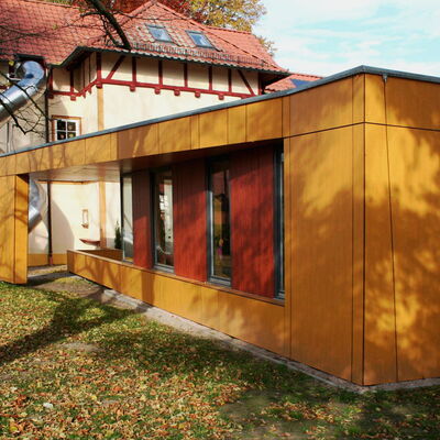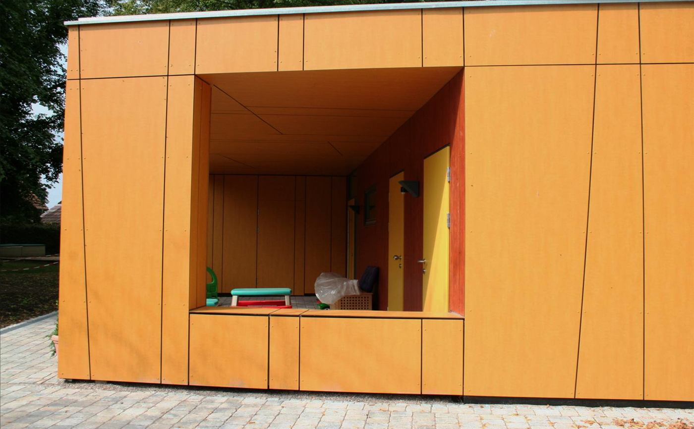 In Anlehnung an die Bauvorgaben Fröbels entwickelt sich das Gebäude aus einem schlichten Kubus (Würfel). Durch die spielerische Auflösung der streng logischen Form des Kubus entsteht eine neue Form des Zusammenwirkens des Baukörpers, in der die Kinder neue Bedingungen, Beziehungen und Relationen entdecken können.
