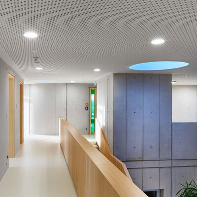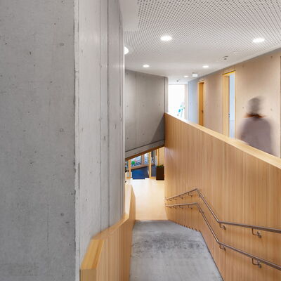 Barrierefrei und ebenerdig liegen die wesentlichen Funktionen Krippe, Kindergarten und der Wirtschaftsbereich im Erdgeschoss. Die stringente Anordnung der Gruppenräume ermöglicht die logische Verknüpfung von Stammgruppen und Funktionsräumen. Die Räumlichkeiten für Elterngespräche und die Sozialarbeit für Kinder mit Migrationshintergrund sind bewusst im Obergeschoss untergebracht. Diese werden von dem zentralen Marktplatz im Erdgeschoss aus erschlossen.
