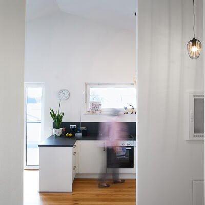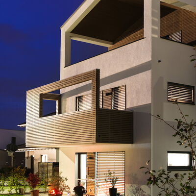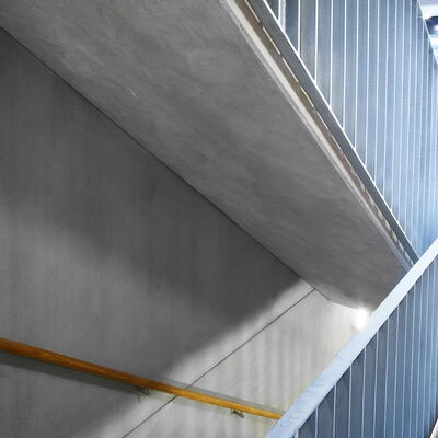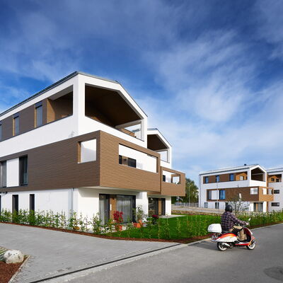 Es wird viel Wert darauf gelegt, dass kostenoptimiertes Bauen dennoch eine architektonische Haltung einnimmt und bautechnische Qualitäten zur Ausführung kommen. So werden die Gebäude massiv errichtet, ohne Wärmedämmverbundsystem, um auch dauerhaft ein gutes Innenraumklima durch einen diffusionsoffenen Fassadenaufbau zu ermöglichen. Sichtbetonflächen im Innenraum sorgen für einen Kontrast zu den verputzten Wohnungen und sind durch Ihre Vorfertigung gleichermaßen kostengünstig in der Verlegung bei bereits fertiger Oberfläche.