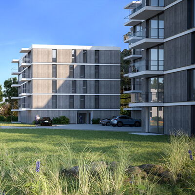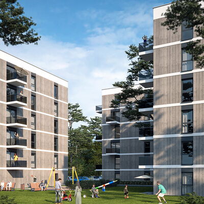 Das Planungskonzept sieht eine klimafreundliche Bebauung mit 4 Punkthäusern und insgesamt 79 Wohneinheiten vor. Die in KN 40 geplanten 6-geschossigen Gebäude sind locker versetzt auf dem Grundstück platziert. Außen- und Innenwände incl. Decken sowie die vorvergraute Fassade sind in Vollholzbauweise rückbau- und wiederverwendbar ausgeführt.