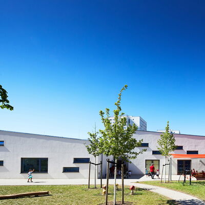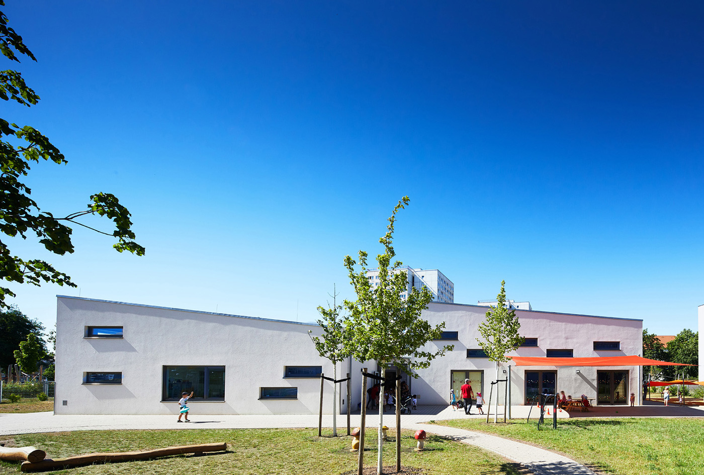 Die KITA-Johannesfeld wurde als Werkstatt für Kinder geplant: Hier kann sich das freie Spiel entwickeln, das Fühlen, die Motorik, die Fantasie sowie die Kreativität der Kinder gefördert werden. Innerhalb des vorgegebenen Baufeldes entfaltet sich der Baukörper mit 4 in der Höhe gestaffelten und in der Dachform dreidimensional geschrägten Kuben. Aus dem eingeschossigen Volumen der Erschließungsfläche brechen die Familieneinheiten horizontal wie vertikal mit gestapelten Ebenen aus.