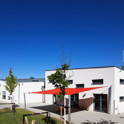 Das Konzept der offenen Arbeit spiegelt sich in den Spielräumen der Kuben wieder. Der pädagogische Nebenraum sowie der Sanitärraum werden von den beiden Gruppenräumen umschlossen. Über eine Kindergalerie kann, über den Nebenraum hinweg, von einem Gruppenraum zum anderen geklettert, geturnt und gekrabbelt werden. Hoch, runter, drüber und drunter; die Räume werden dreidimensional erlebbar. Die Sanitärbereiche werden über ein großzügiges Oberlicht natürlich belichtet. An den Seiten der Kuben sind jeweils Kindergarderoben mit eigenem Zugang ins Freigelände platziert.