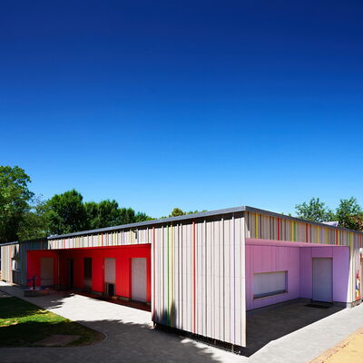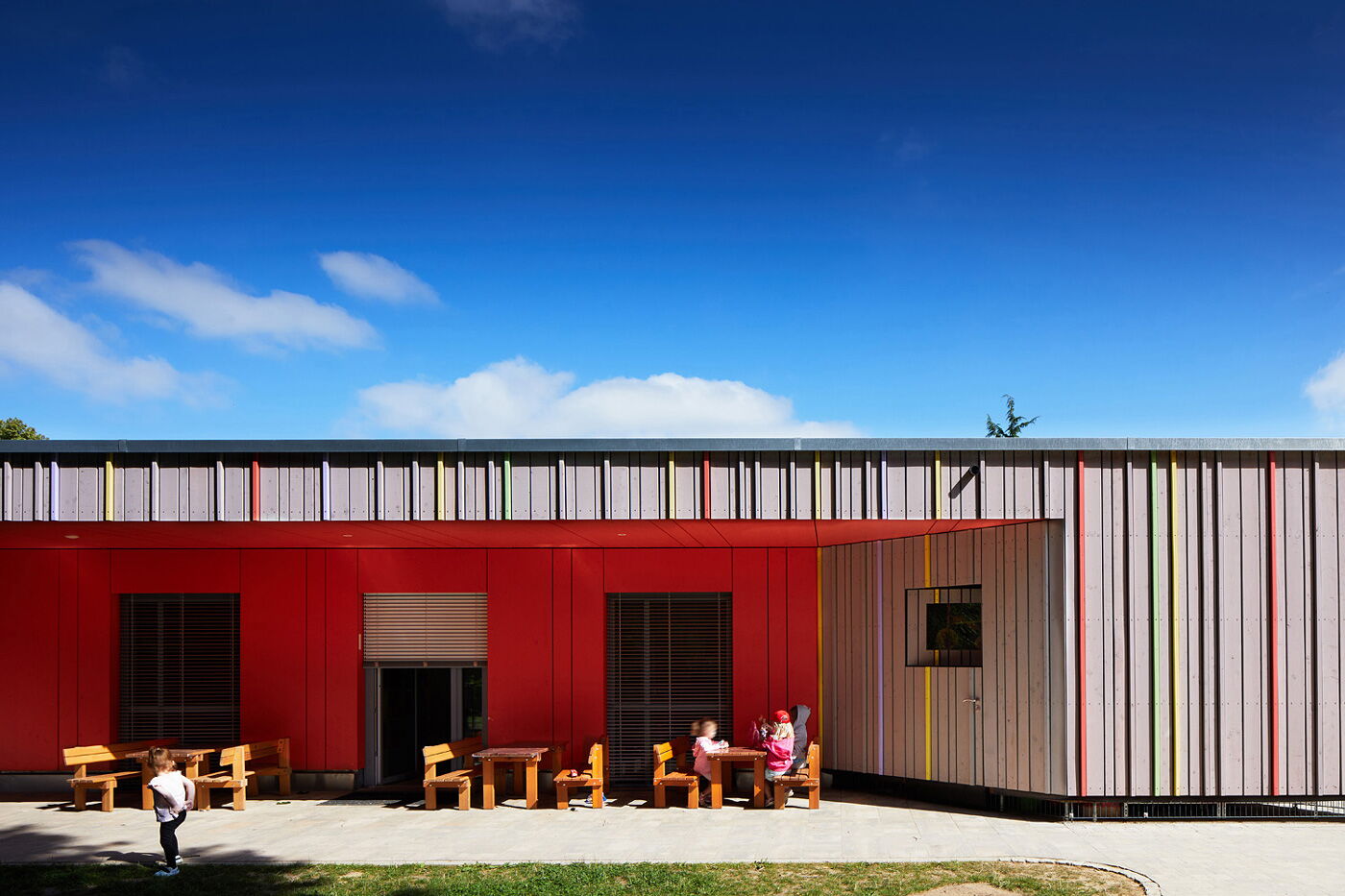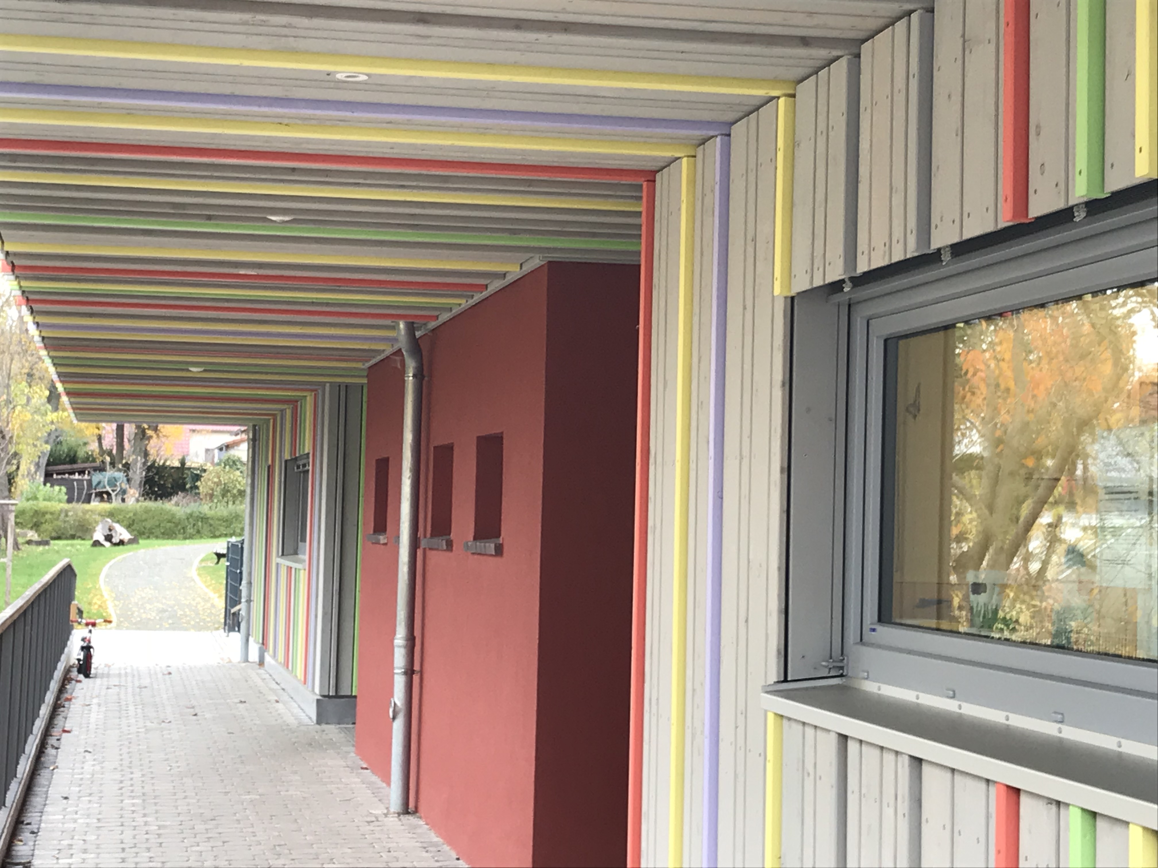Der Kindergarten ersetzt den Vorgängerbau aus den 1930er Jahren, der aufgrund der heutigen statischen Anforderungen nicht mehr erweiterbar war. Der eingeschossige Neubau unterteilt sich in einen Gruppenraum für die Kindergrippe und 3 Gruppenräumen für den Kindergarten, mit jeweils eigenem Zugang.