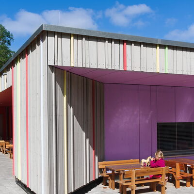 Der neue Kindergarten bietet Platz für mehr als 40 Kinder. Alle Gruppenräume und der Mehrzweckraum haben vorgelagerte Terrassen mit Ausgängen unmittelbar in den Außenbereich. Dies soll dem pädagogischen Modell folgend, den Bezug der Kinder zur Umwelt schärfen. Dementsprechend wurde das Gebäude vorrangig aus nachwachsenden Rohstoffen, auch durch die markante Holzschalung als Fassadenbekleidung ablesbar, errichtet.