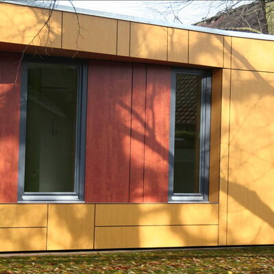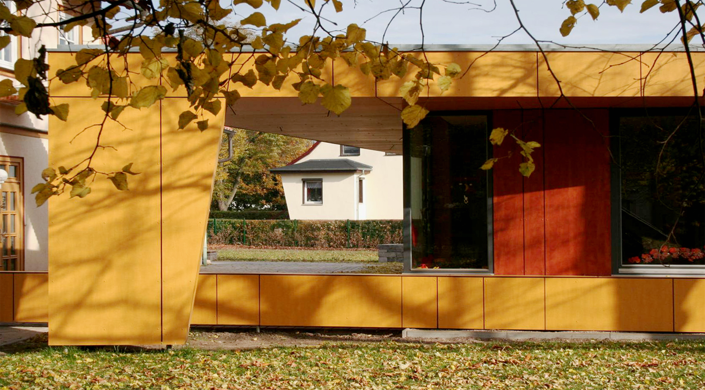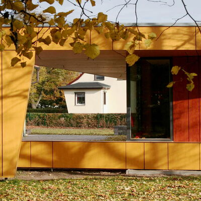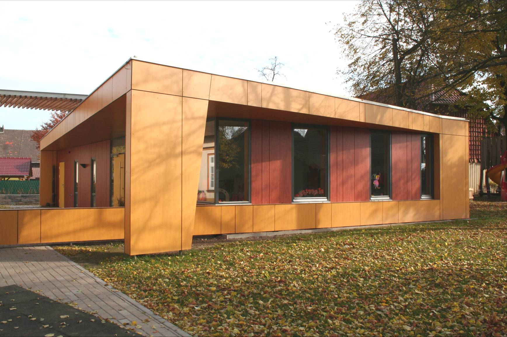 In Anlehnung an die Bauvorgaben Fröbels entwickelt sich das Gebäude aus einem schlichten Kubus (Würfel). Durch die spielerische Auflösung der streng logischen Form des Kubus entsteht eine neue Form des Zusammenwirkens des Baukörpers, in der die Kinder neue Bedingungen, Beziehungen und Relationen entdecken können.