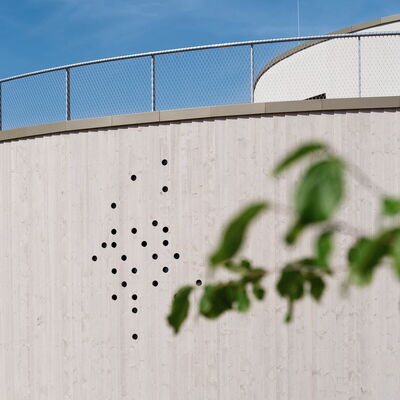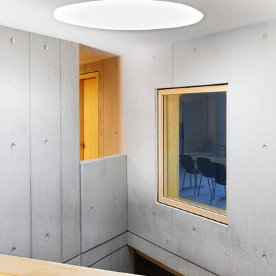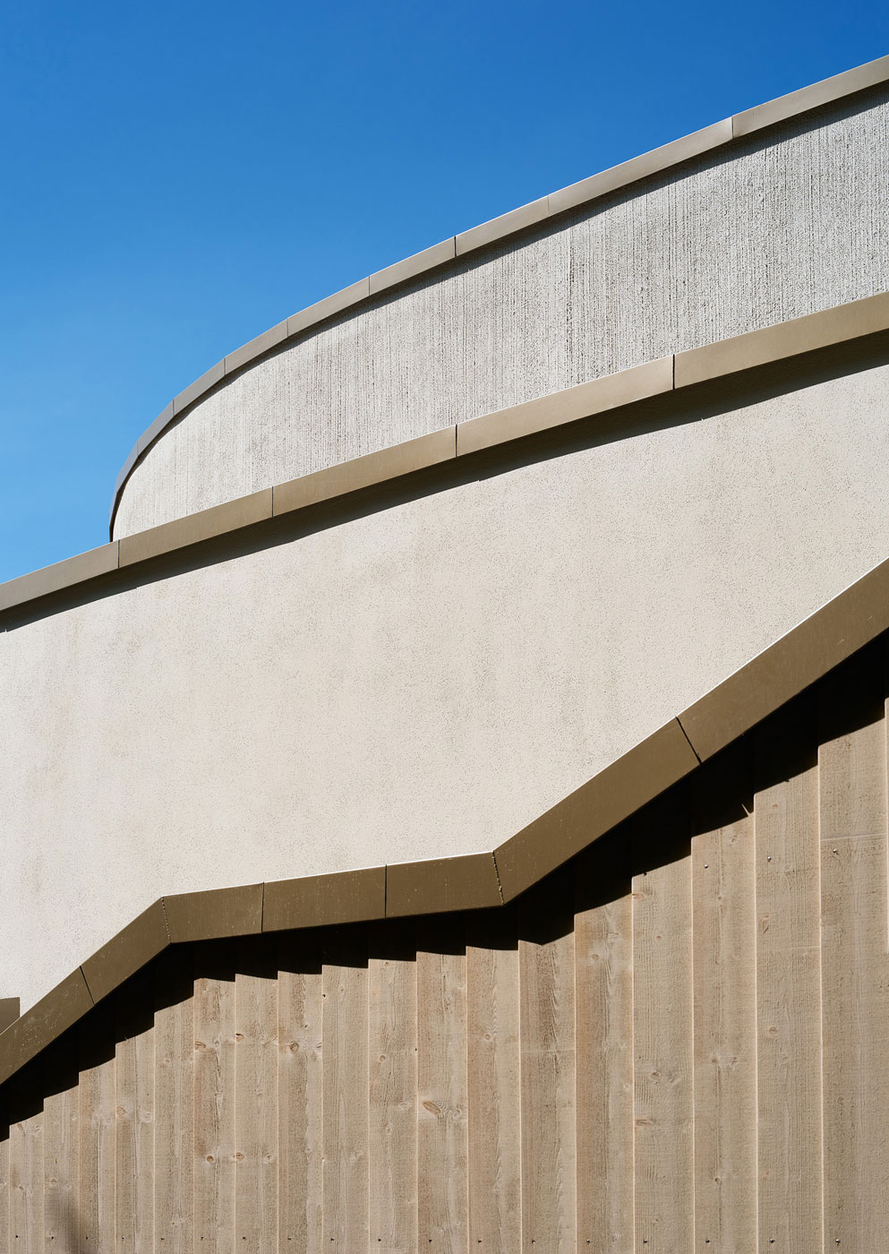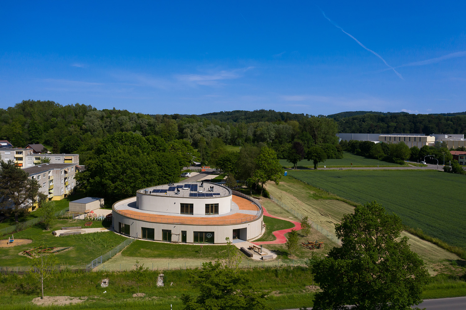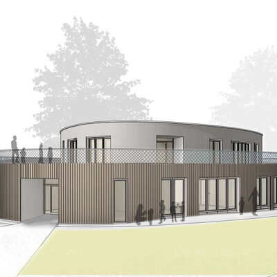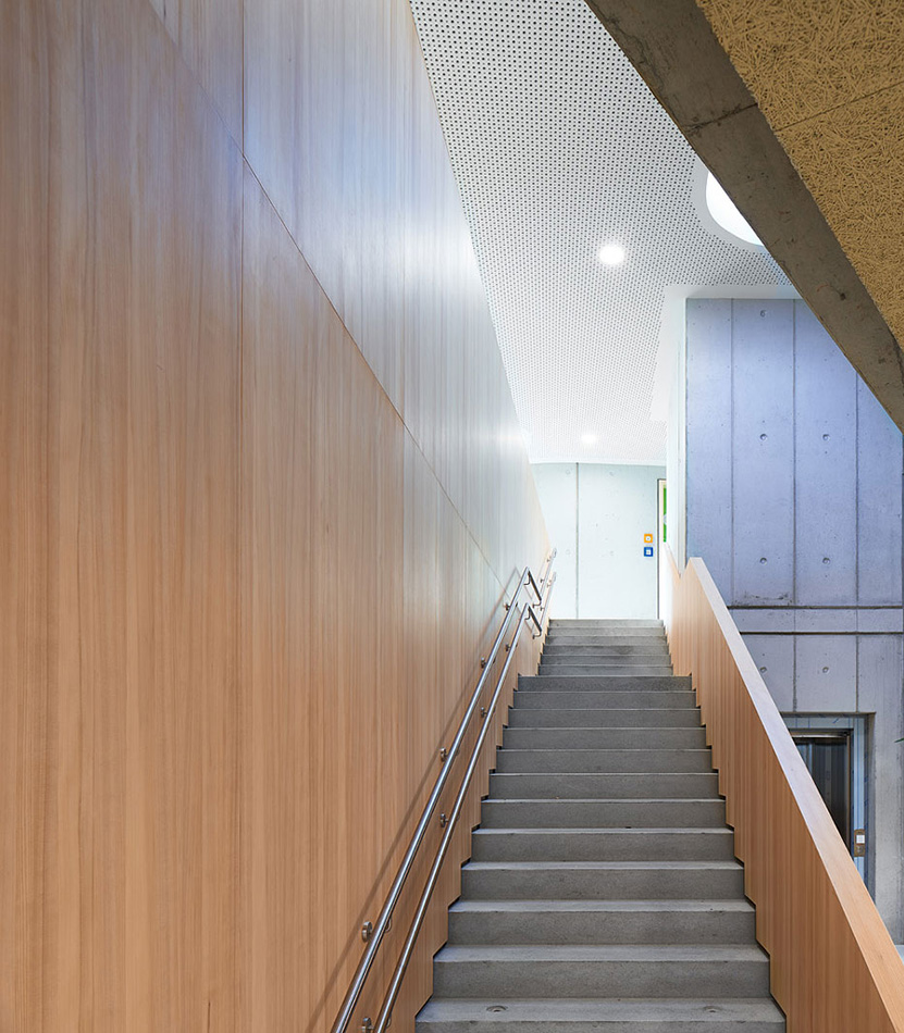 Der frei geschwungene Baukörper ist identitätsstiftend und ein kraftvoller Abschluss der umgebenden Wohnbebauung. Gleichzeitig liegt er, fließend eingebunden mit den Funktionen der Freibereiche, in dem sich öffnenden Grünzug. Der großzügige Windfangbereich ist Ankunftsort, Marktplatz und Verteiler, zentral als Auftakt des Gebäudes gelegen.