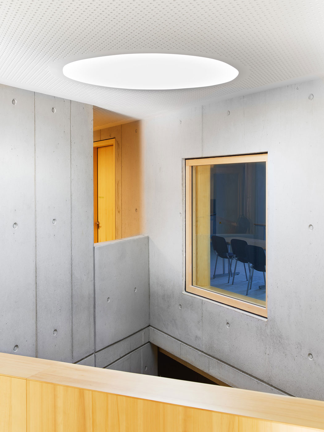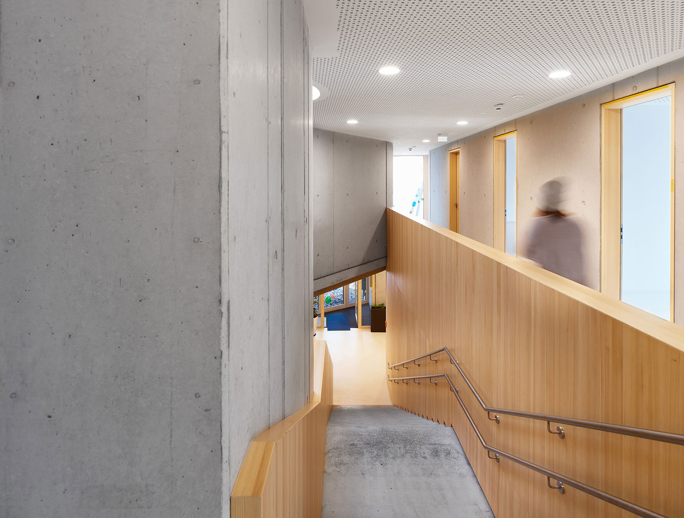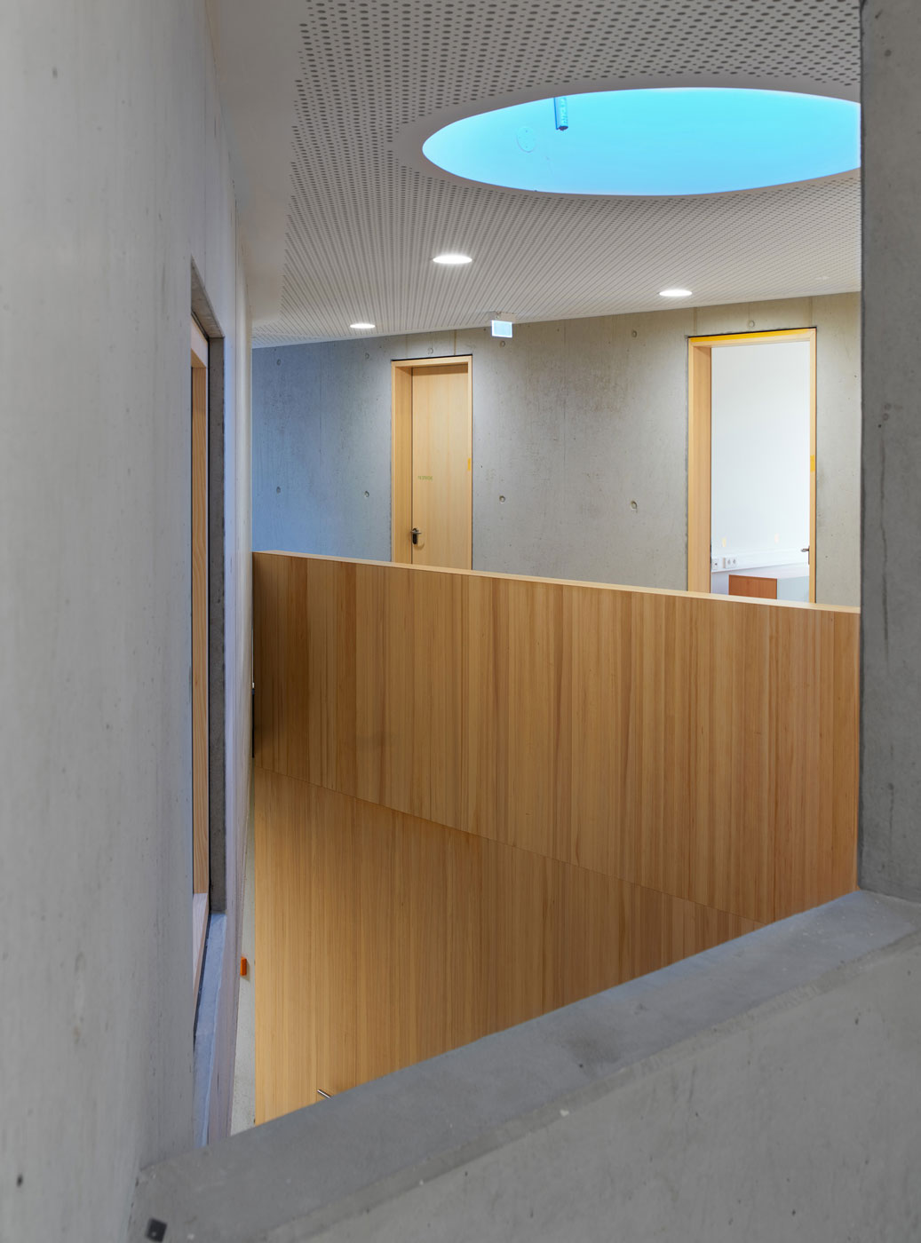 Barrierefrei und ebenerdig liegen die wesentlichen Funktionen Krippe, Kindergarten und der Wirtschaftsbereich im Erdgeschoss. Die stringente Anordnung der Gruppenräume ermöglicht die logische Verknüpfung von Stammgruppen und Funktionsräumen. Die Räumlichkeiten für Elterngespräche und die Sozialarbeit für Kinder mit Migrationshintergrund sind bewusst im Obergeschoss untergebracht. Diese werden von dem zentralen Marktplatz im Erdgeschoss aus erschlossen.
