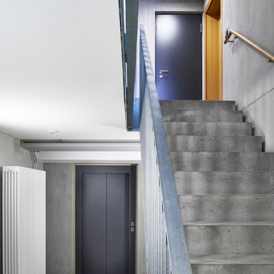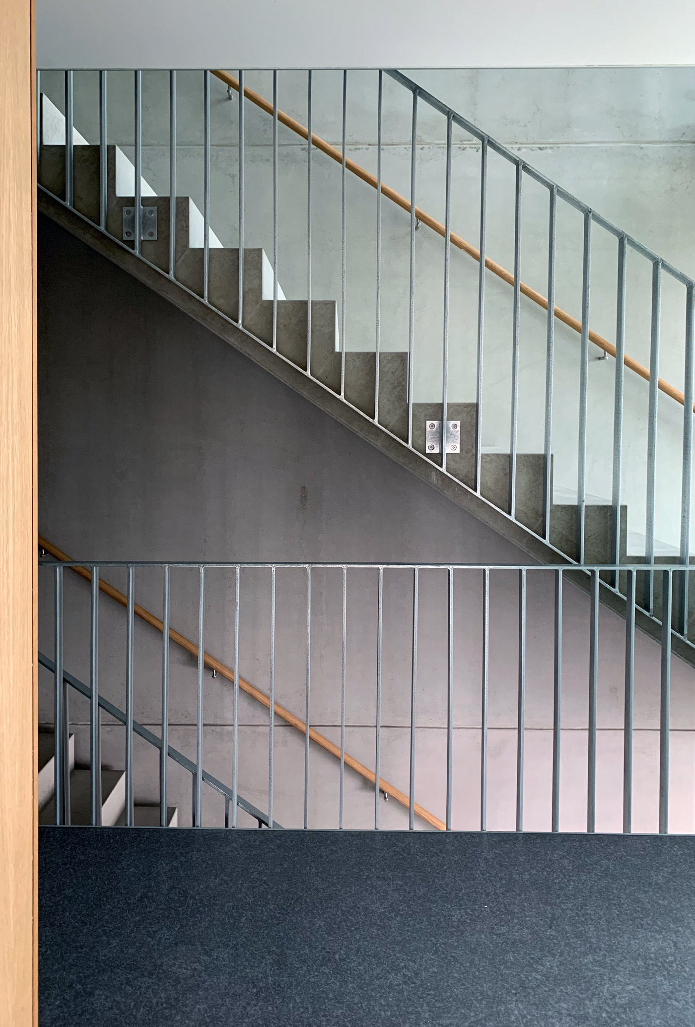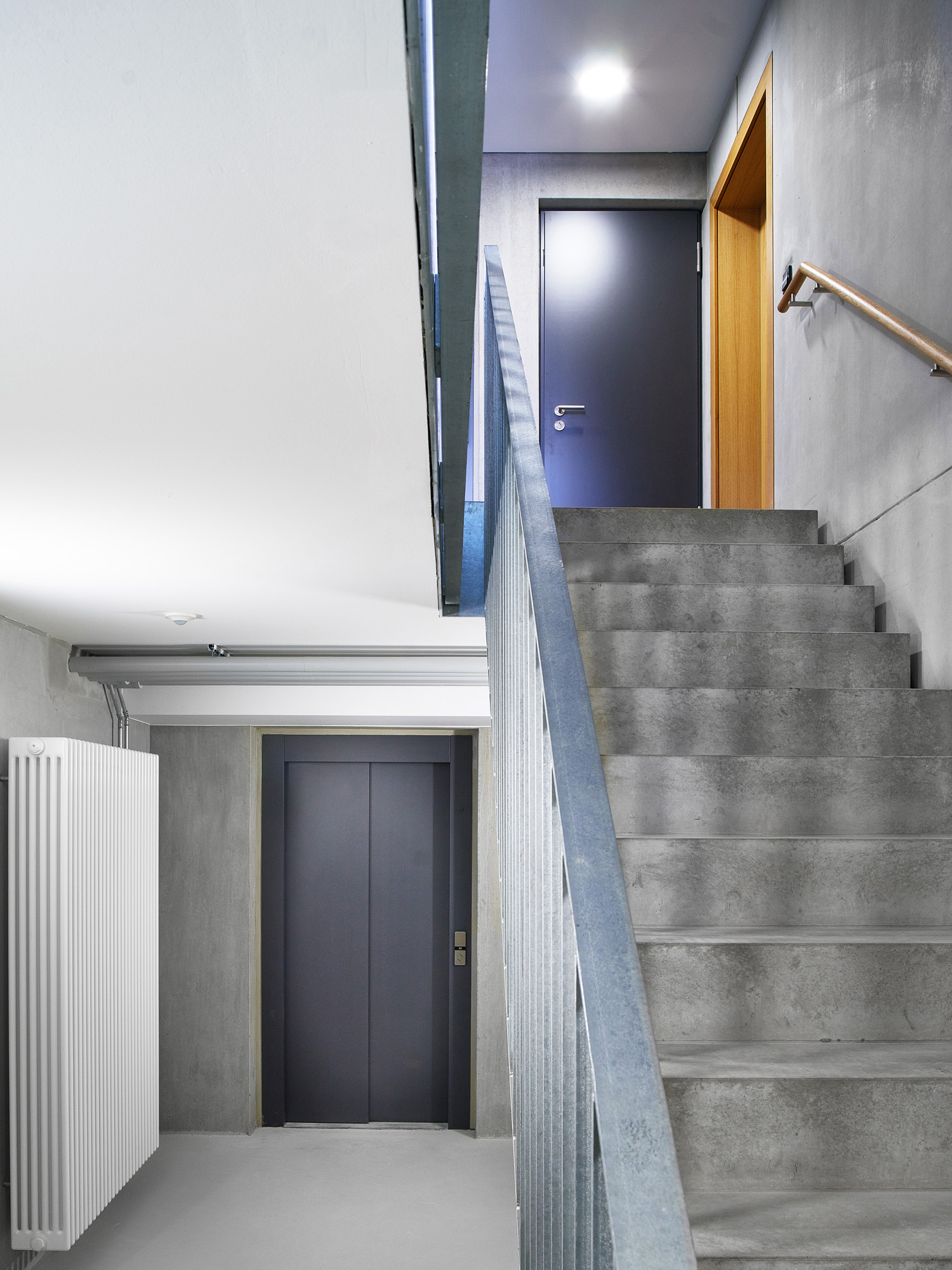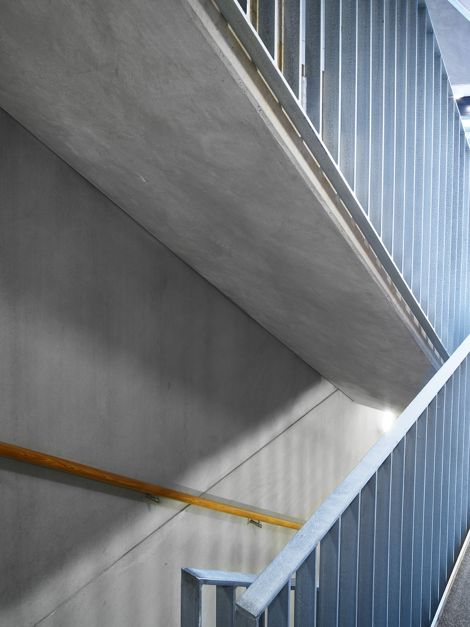 Es wird viel Wert darauf gelegt, dass kostenoptimiertes Bauen dennoch eine architektonische Haltung einnimmt und bautechnische Qualitäten zur Ausführung kommen. So werden die Gebäude massiv errichtet, ohne Wärmedämmverbundsystem, um auch dauerhaft ein gutes Innenraumklima durch einen diffusionsoffenen Fassadenaufbau zu ermöglichen. Sichtbetonflächen im Innenraum sorgen für einen Kontrast zu den verputzten Wohnungen und sind durch Ihre Vorfertigung gleichermaßen kostengünstig in der Verlegung bei bereits fertiger Oberfläche.