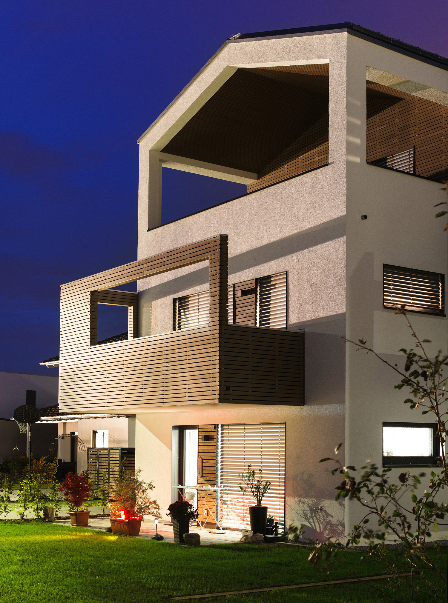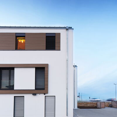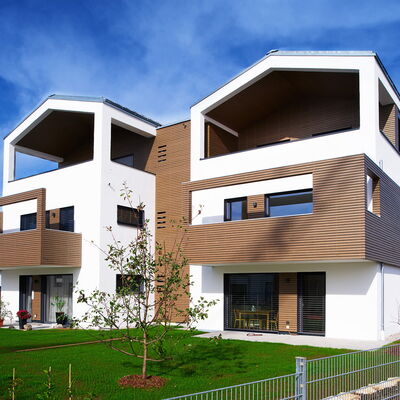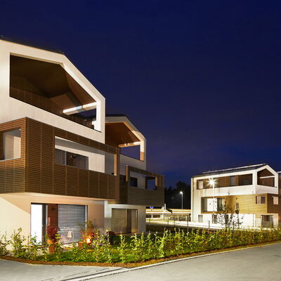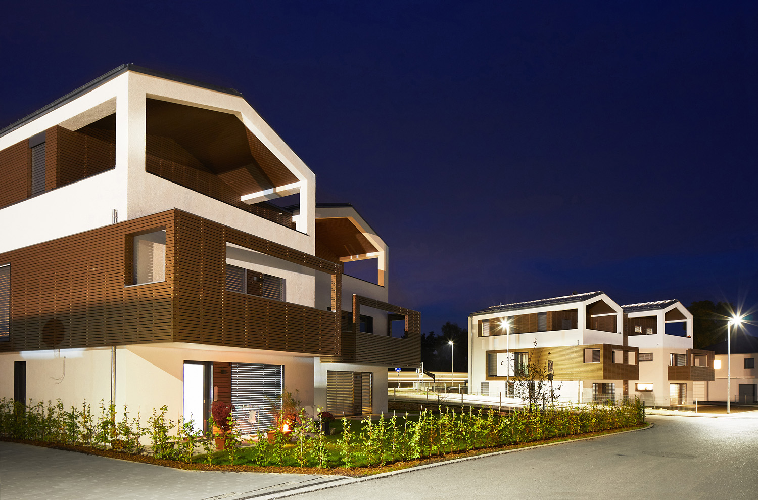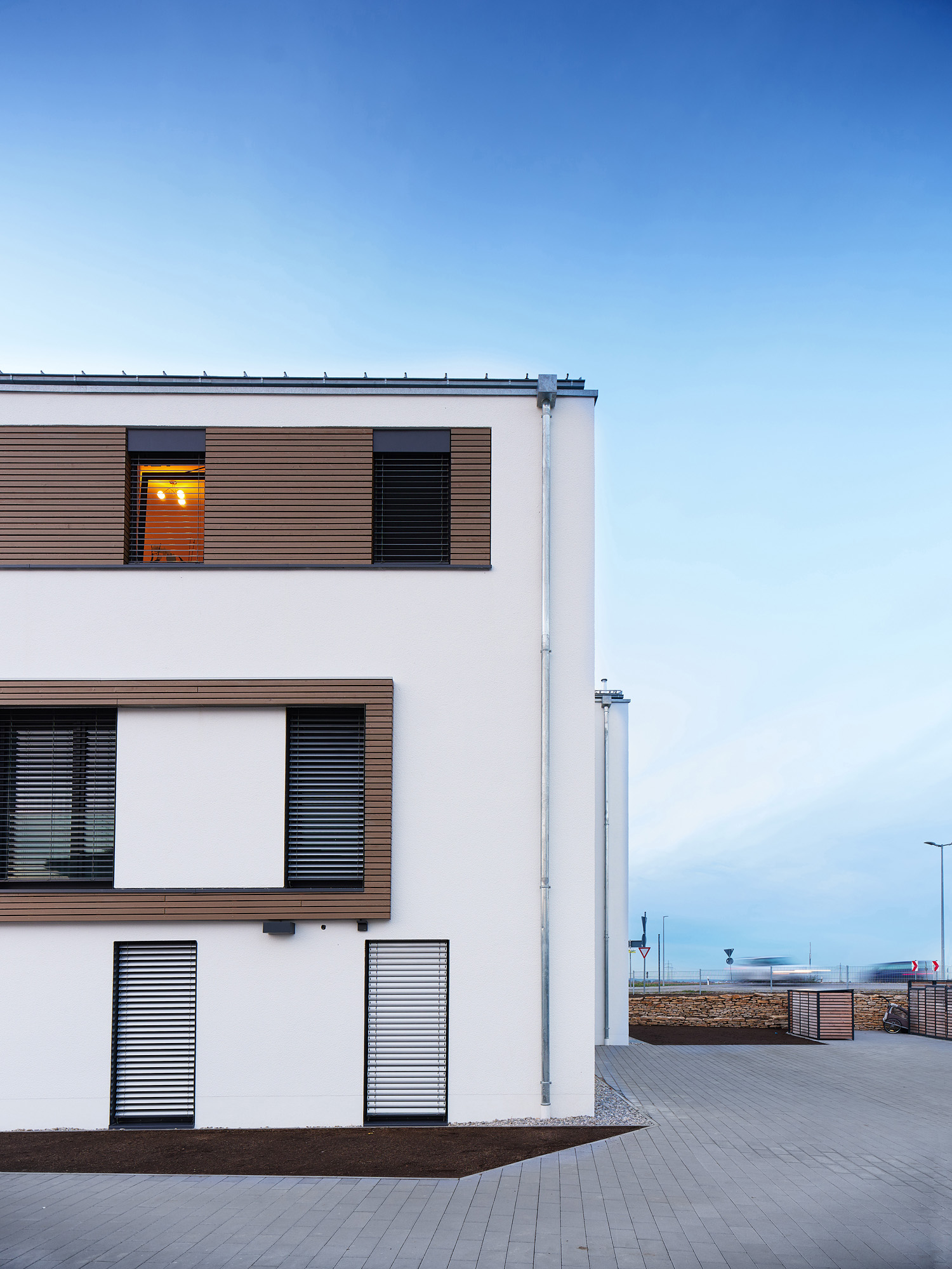 Es wird viel Wert darauf gelegt, dass kostenoptimiertes Bauen dennoch eine architektonische Haltung einnimmt und bautechnische Qualitäten zur Ausführung kommen. So werden die Gebäude massiv errichtet, ohne Wärmedämmverbundsystem, um auch dauerhaft ein gutes Innenraumklima durch einen diffusionsoffenen Fassadenaufbau zu ermöglichen. Sichtbetonflächen im Innenraum sorgen für einen Kontrast zu den verputzten Wohnungen und sind durch Ihre Vorfertigung gleichermaßen kostengünstig in der Verlegung bei bereits fertiger Oberfläche.