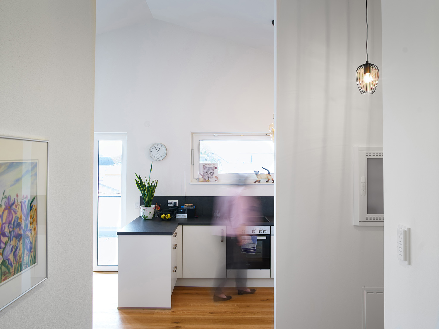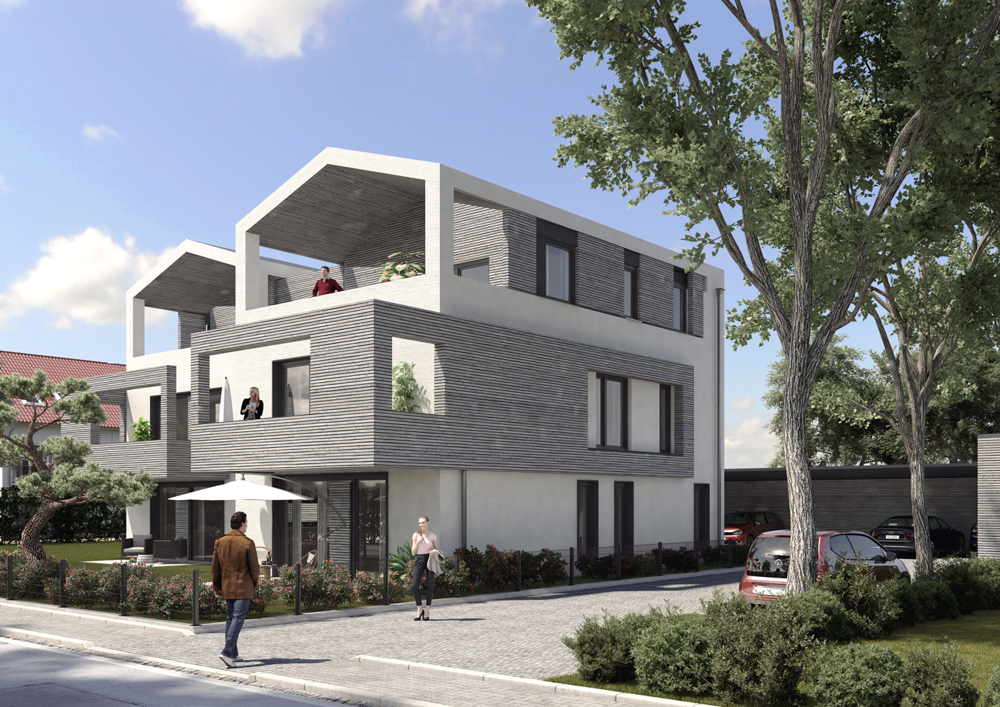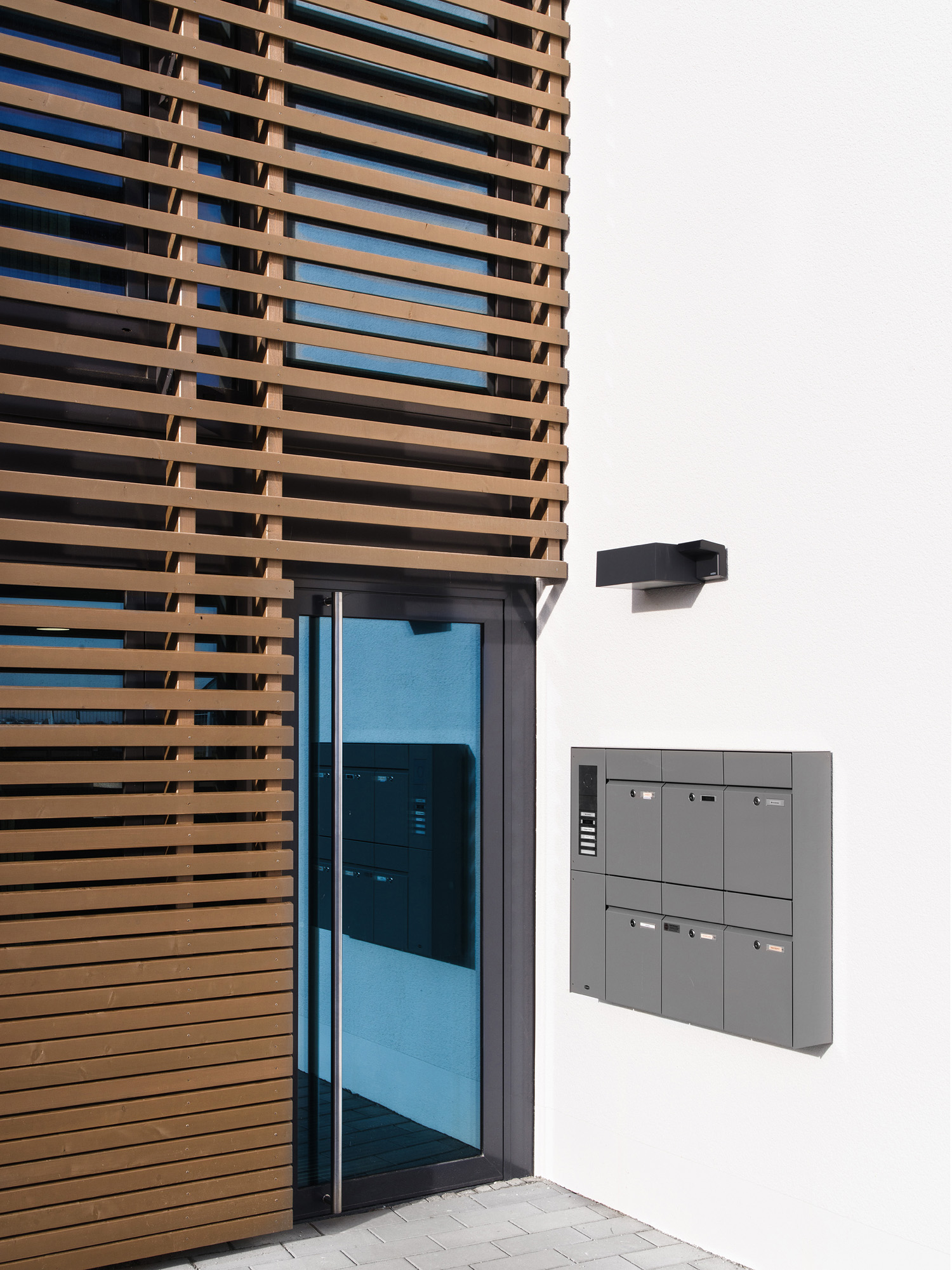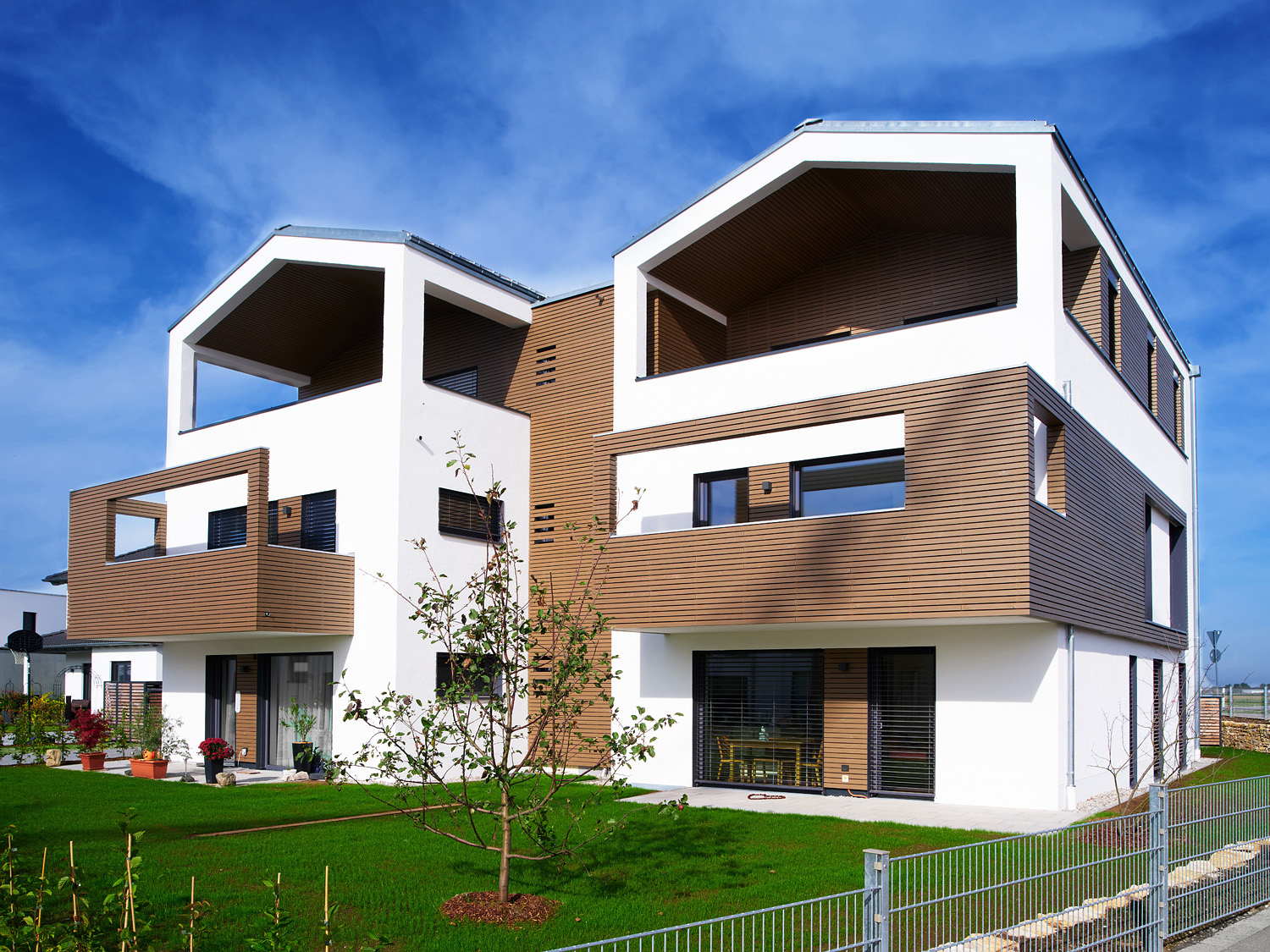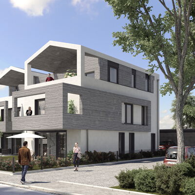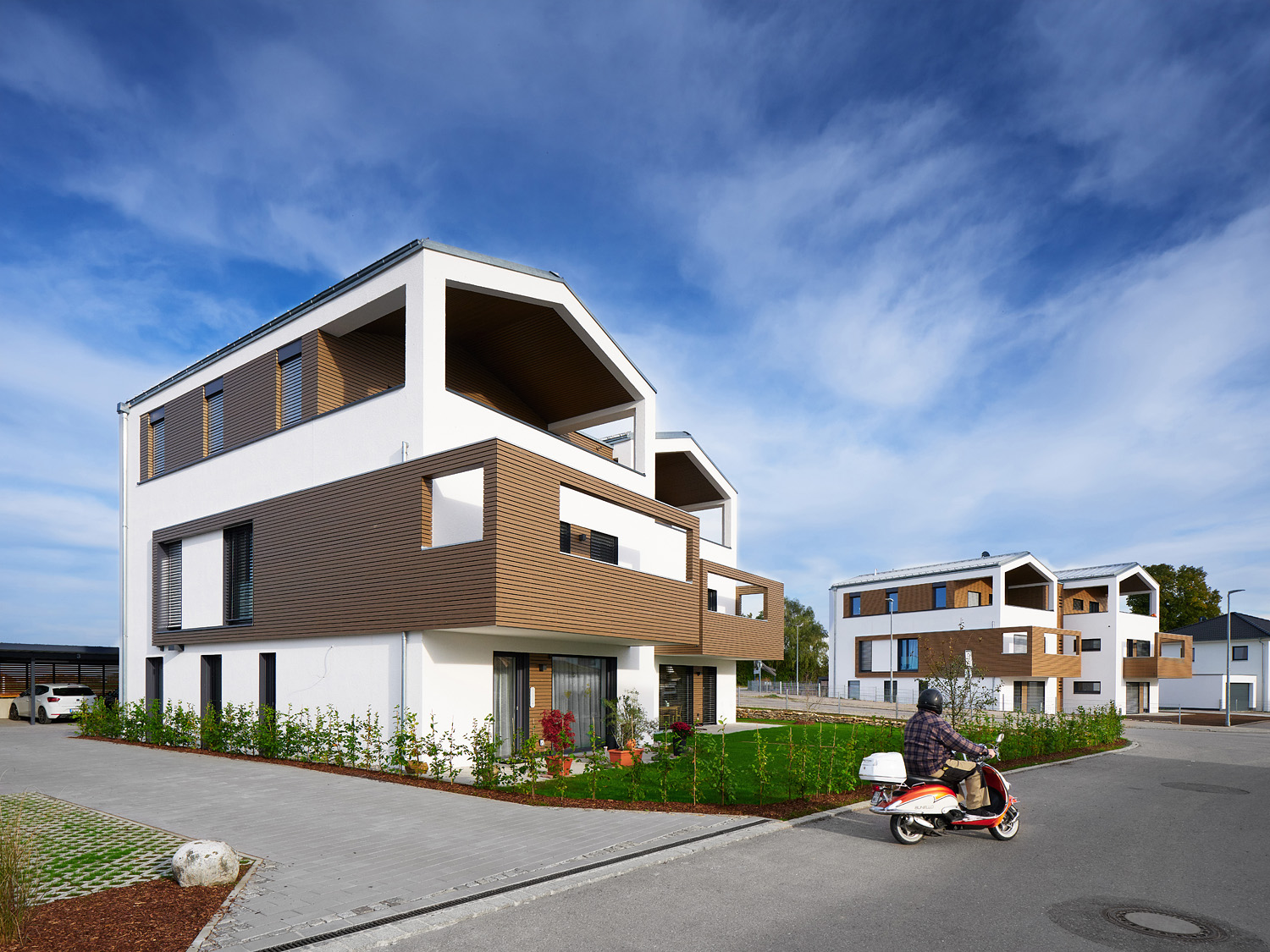 Für die optische Erscheinung zur Einfügung in das Ortsbild, wurden die Baumassen auf jeweils 2 Teilhäuser mit gemeinsamer Erschließung verteilt. So konnte das Baufeld optimal ausgenutzt werden. Die Wohnungen wurden bedarfsgerecht und förderfähig geplant.