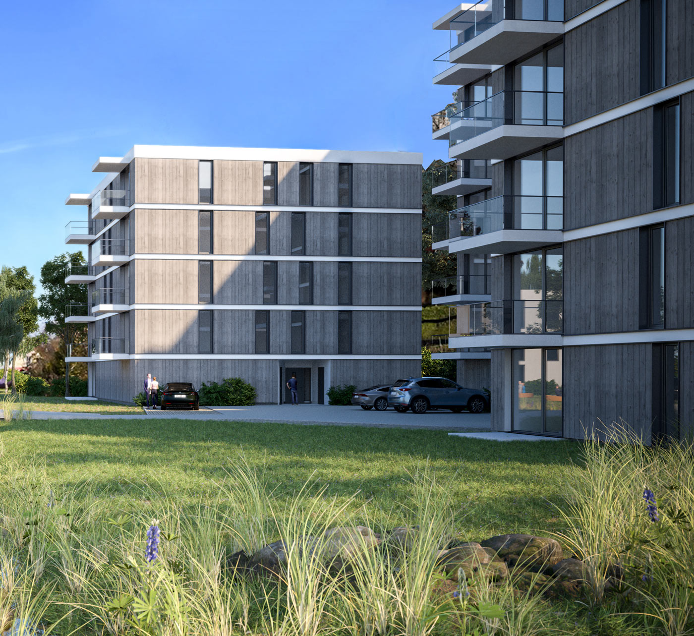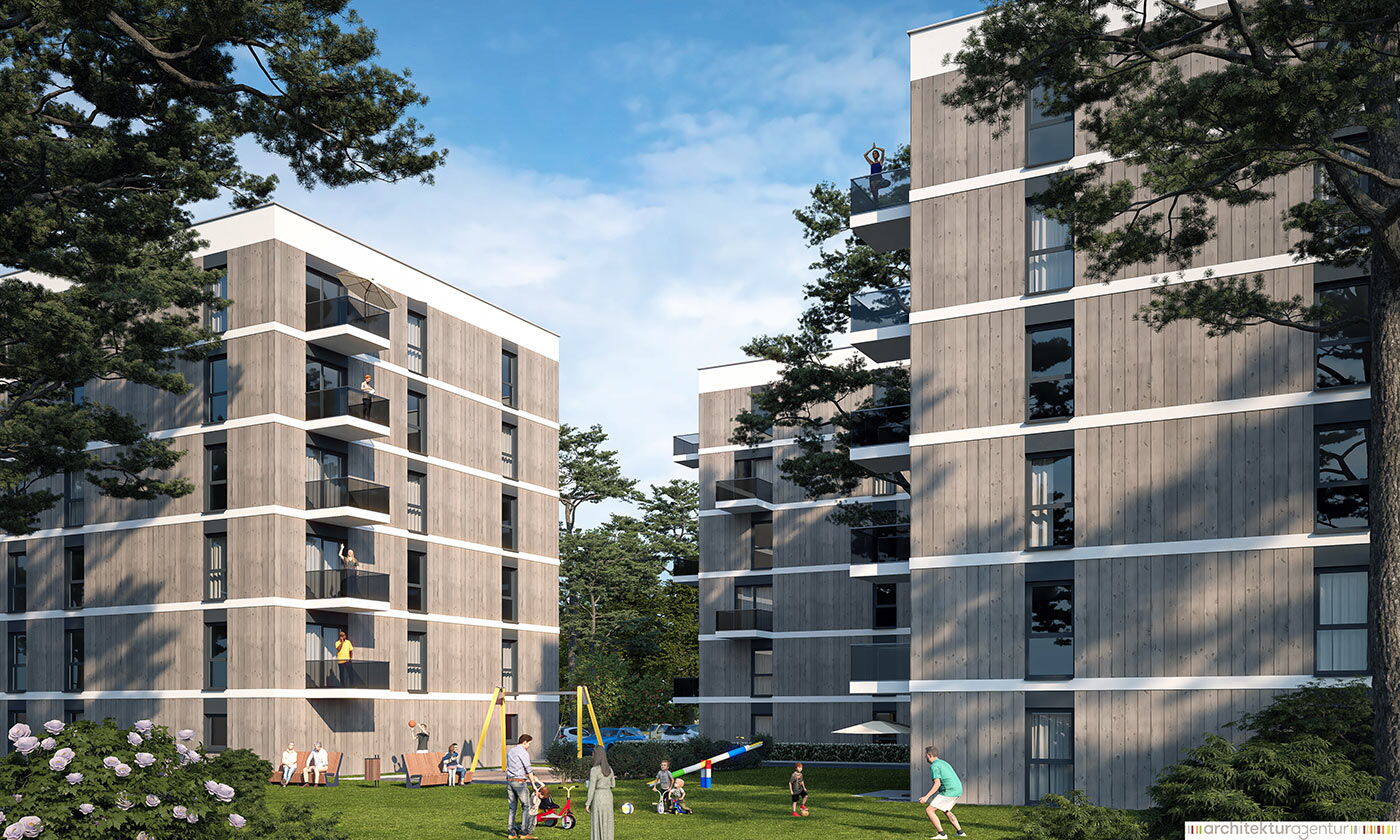 Das Planungskonzept sieht eine klimafreundliche Bebauung mit 4 Punkthäusern und insgesamt 79 Wohneinheiten vor. Die in KN 40 geplanten 6-geschossigen Gebäude sind locker versetzt auf dem Grundstück platziert. Außen- und Innenwände incl. Decken sowie die vorvergraute Fassade sind in Vollholzbauweise rückbau- und wiederverwendbar ausgeführt.